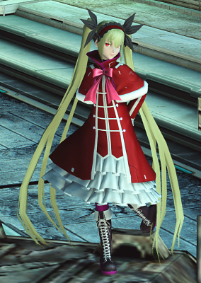 修道女の服をイメージしたワンピース。初期配信カラーのひとつ。肩から腕にかけての飾りが赤紫色固定のため、紅(赤)以外は違和感が強すぎて好きになれなかったかな。最初、赤にしたのは髪が金色なので、服が赤いと映えるかなていう程度だったけど、偶然あたりを引いたって感じ。ストレートヘアだと頭がのっぺりしちゃうので、同じ色のベレー帽をいつもセットでかぶってます。